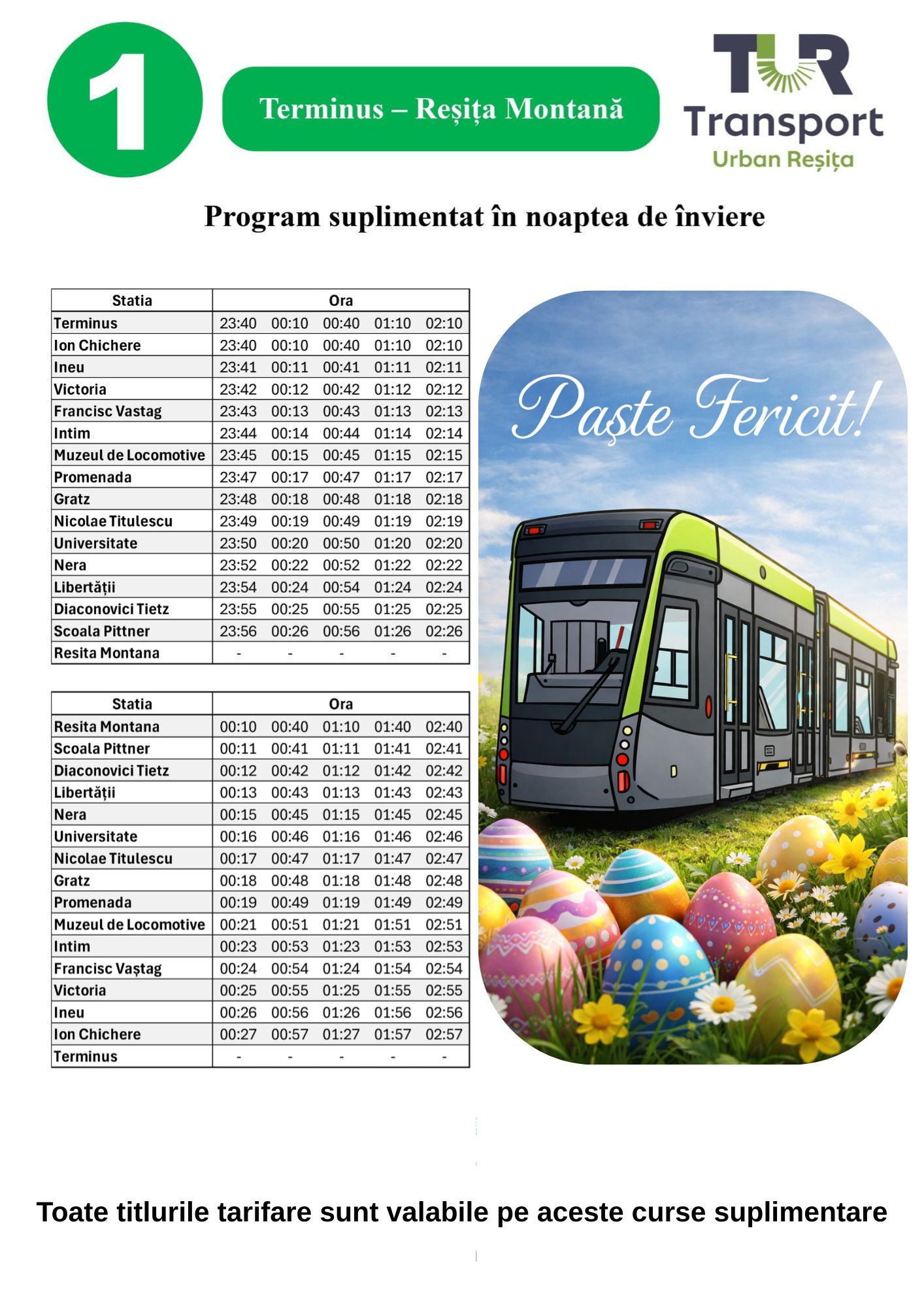 Cu ocazia Învierii, în noaptea dintre 11 – 12 aprilie, programul tramvaielor va fi suplimentat, conform graficului din imagine.